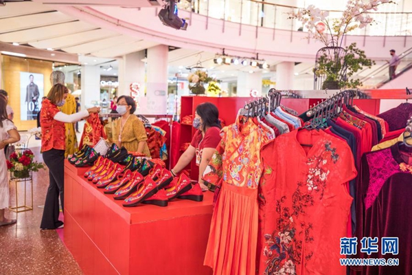 2月9日,顧客在泰國曼谷一家商場購買春節禮服。[新華社記者 張可任 攝]