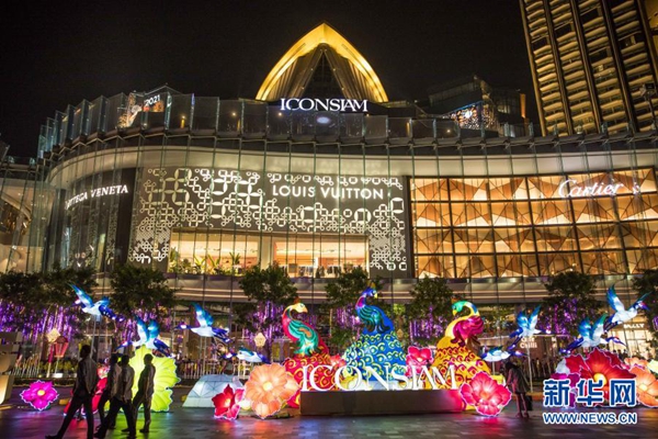 2月7日,顧客從泰國曼谷暹羅天地商場的花燈旁經過。[新華社記者 張可任 攝]