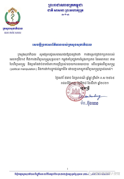 柬埔寨衛生部公開發表聲明堅決反對將病毒溯源政治化