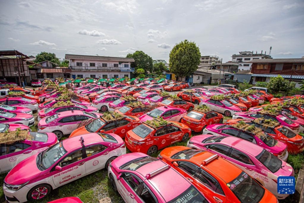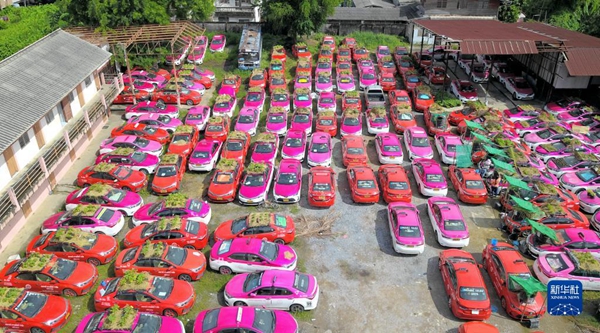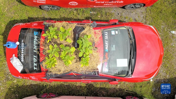 這是9月24日在泰國首都曼谷一個停車場拍攝的出租車“菜園”。[新華社記者 王騰 攝]
