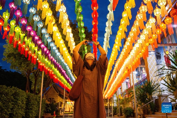 10月25日,游客在泰國南奔府哈利奔猜寺為各色燈籠拍照。[新華社記者 王騰 攝]
