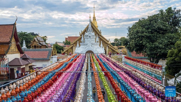 這是10月25日在泰國南奔府哈利奔猜寺用無人機拍攝的各色燈籠。[新華社記者 王騰 攝]