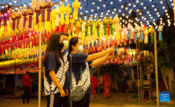 10月25日,游客在泰國南奔府哈利奔猜寺的各色燈籠下自拍合影。[新華社記者 王騰 攝]