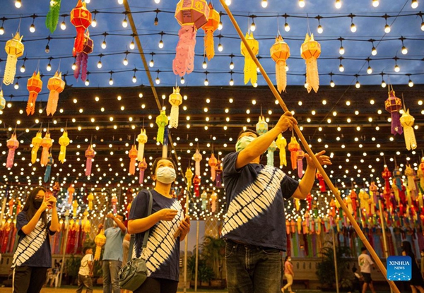 10月25日,游客在泰國南奔府哈利奔猜寺將燈籠掛起。[新華社記者 王騰 攝]