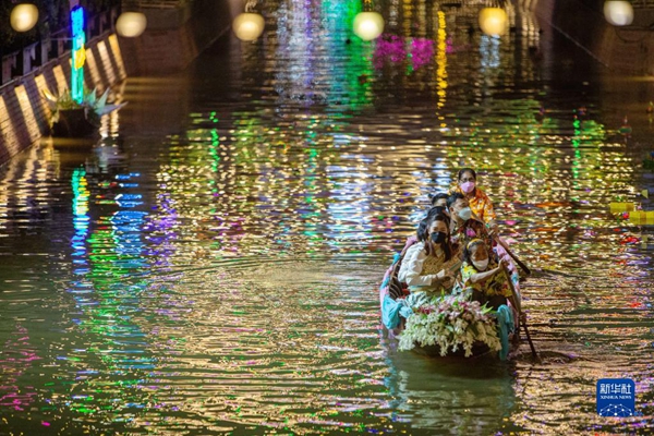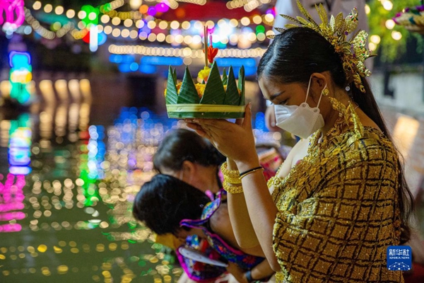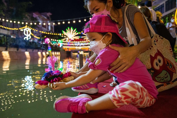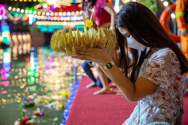 11月19日,戴口罩的民眾在泰國曼谷翁昂運河邊放水燈。[新華社記者 王騰 攝]