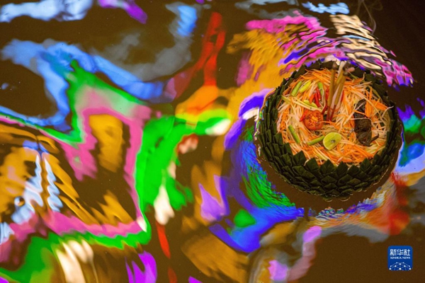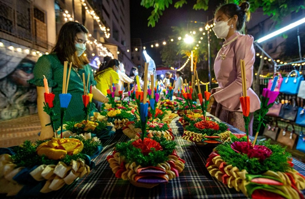 11月19日,戴口罩的民眾在泰國曼谷翁昂運河步行街購買水燈。[新華社記者 王騰 攝]