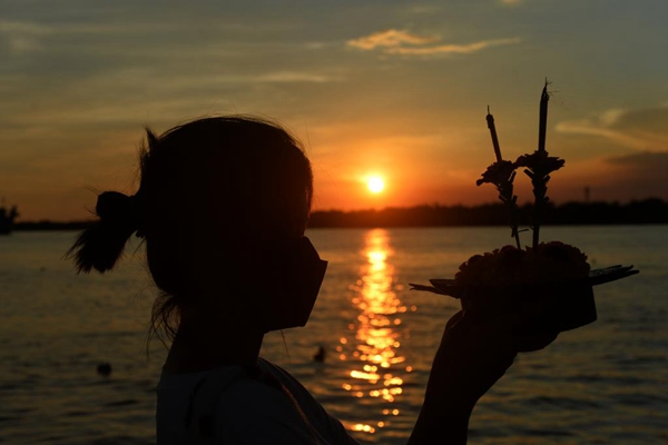 11月19日,一名戴口罩的女子在泰國曼谷翁昂運河邊放水燈。[新華社記者 王騰 攝]