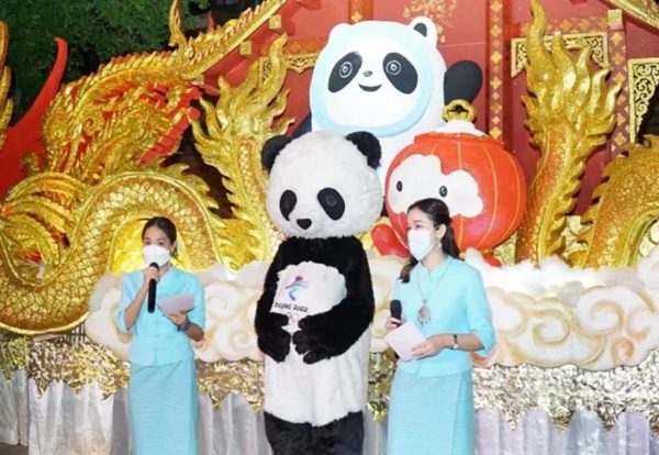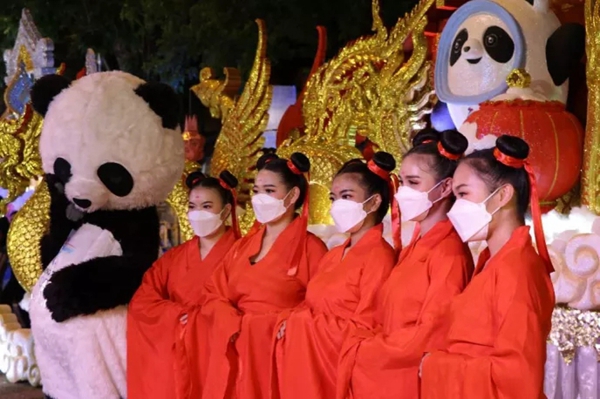 中國駐清邁總領館也受邀參展,展位在主會場塔佩門??傤I館對花車進行了精心設計,主體為鑲嵌總領館建館30周年徽標的泰式殿堂,中間是活潑可愛的2022年北京冬奧會吉祥物“冰墩墩”和冬殘奧會吉祥物“雪容融”,環繞四周的是龍、鳳、祥云和燈籠等中泰兩國共有的文化元素,寓意中泰文化和諧互融、美美與共。