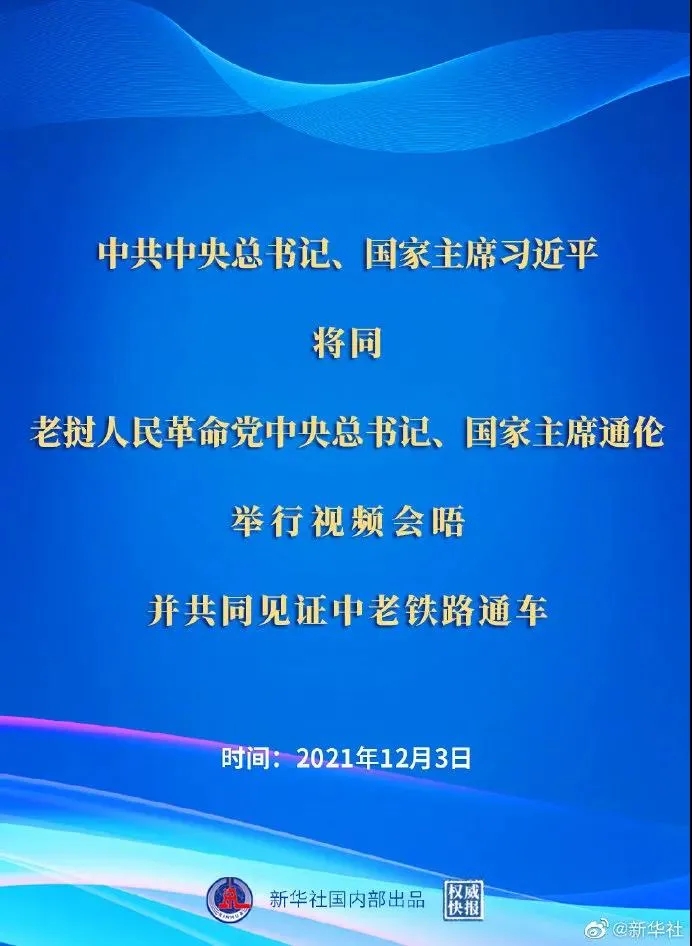 外交部發言人華春瑩12月1日宣布:中共中央總書記、國家主席習近平將于12月3日同老撾人民革命黨中央總書記、國家主席通倫舉行視頻會晤,并以視頻連線形式共同見證中老鐵路通車。
