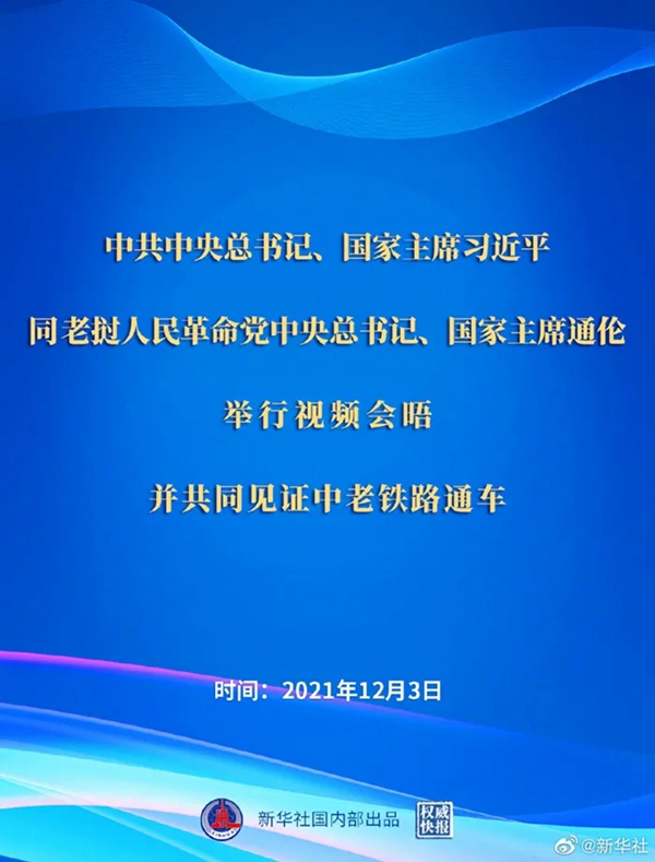 中共中央總書記、國家主席習近平12月3日同老撾人民革命黨中央總書記、國家主席通倫舉行視頻會晤,并以視頻連線形式共同見證中老鐵路通車。