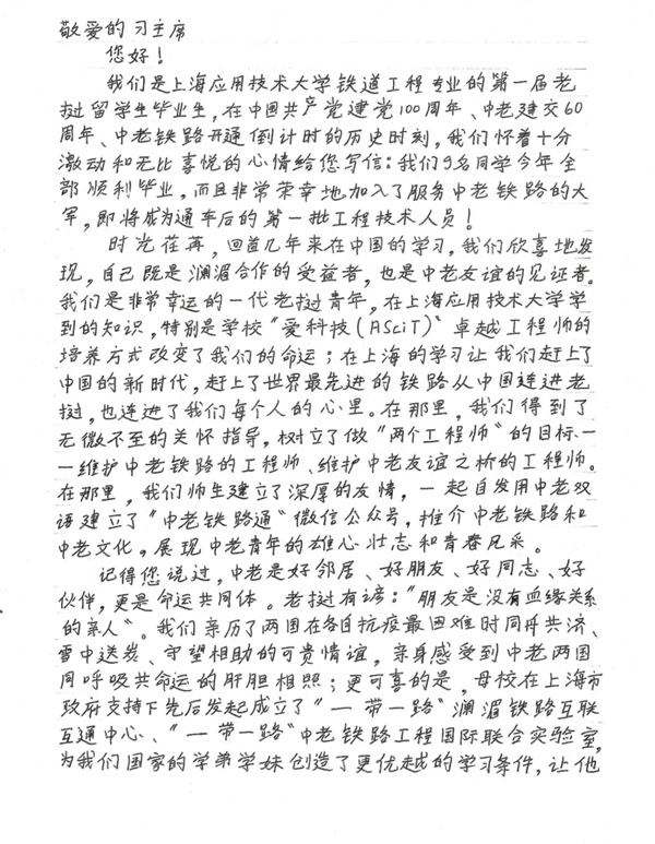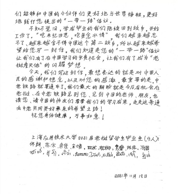 這封來信是上海應用技術大學鐵道工程專業的第一屆老撾留學生聯合書寫的。9名同學今年全部順利畢業,成為中老鐵路通車后的第一批工程技術人員。