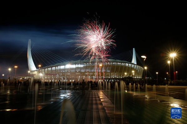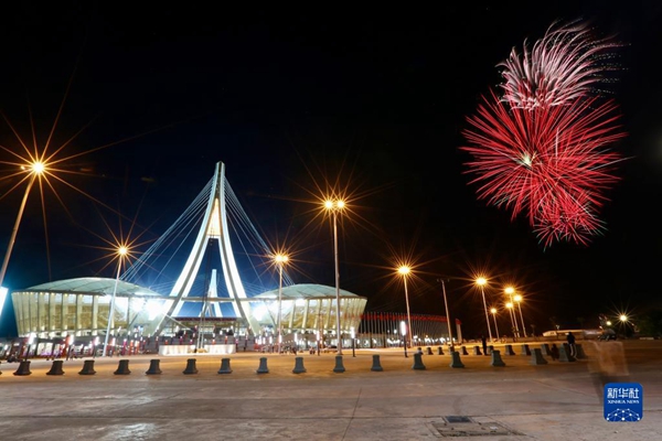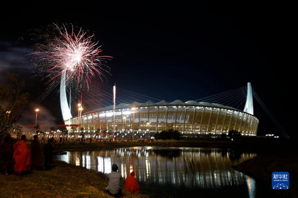 12月18日,焰火在柬埔寨金邊的柬埔寨國家體育場上空燃放。新華社發(索萬納拉攝)