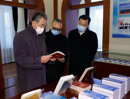 調研期間,王毅參觀了研究中心陳列室,外交部副部長謝鋒、國研院院長徐步等陪同。