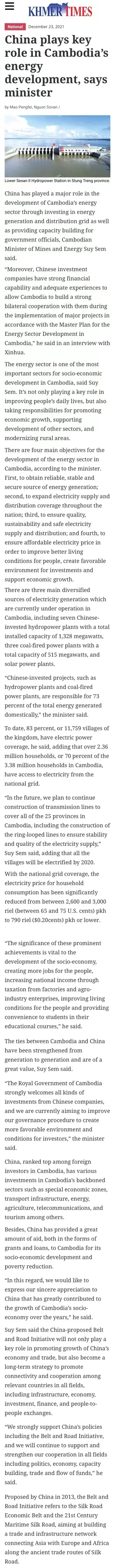 據柬埔寨《高棉時報》12月23日報道,柬埔寨礦產能源部大臣瑞賽高度評價中國在柬能源發展中發揮的關鍵作用。瑞賽表示,中國投資的水力發電廠和燃煤發電廠等項目為柬國內總發電量貢獻了 73%。迄今為止,柬 83%的村莊實現電力覆蓋,超過 70%的家庭可以從國家電網獲得電力,電價也隨之大幅下降。