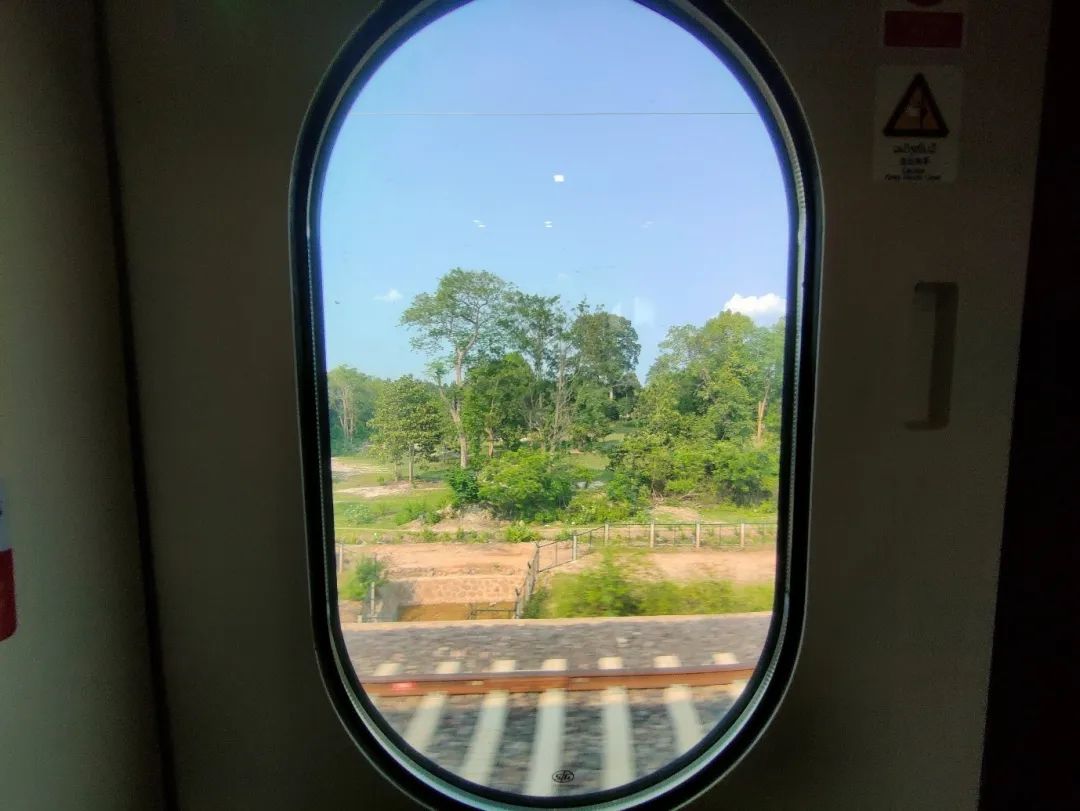 已工作的老撾同學還特地挑選了絕佳拍攝點,以獨特的視角向大家展示了瀾滄號動車組開出車站后奔馳在中老鐵路上的壯觀場景。
