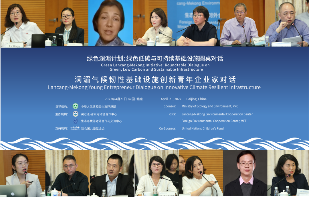 2022年4月21日,綠色瀾湄計劃:綠色低碳與可持續基礎設施圓桌對話——瀾湄氣候韌性基礎設施創新青年企業家對話以線上線下結合形式在京召開。會議由瀾滄江-湄公河環境合作中心/生態環境部對外合作與交流中心(以下簡稱中心)主辦,聯合國兒童基金會支持。來自瀾湄國家氣候與環境部門、聯合國兒童基金會區域與駐華機構、企業、相關國際組織和研究機構近200人參加會議。