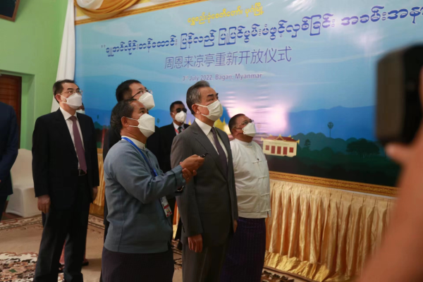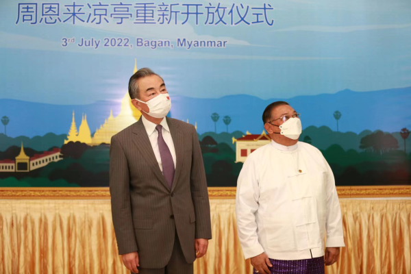 當地時間2022年7月3日,中國駐緬甸使館和緬甸外交部在蒲甘共同舉行周恩來涼亭修復后重新對外開放儀式。來緬主持瀾湄合作第七次外長會的國務委員兼外長王毅同緬甸外長溫納貌倫共同出席。