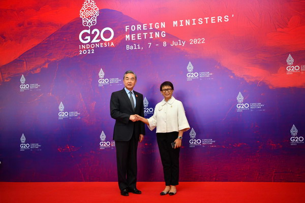 當地時間2022年7月8日,國務委員兼外長王毅在巴厘島出席二十國集團外長會。印尼外長蕾特諾主持會議。二十國集團成員和嘉賓國外長、聯合國秘書長古特雷斯等國際組織負責人與會。