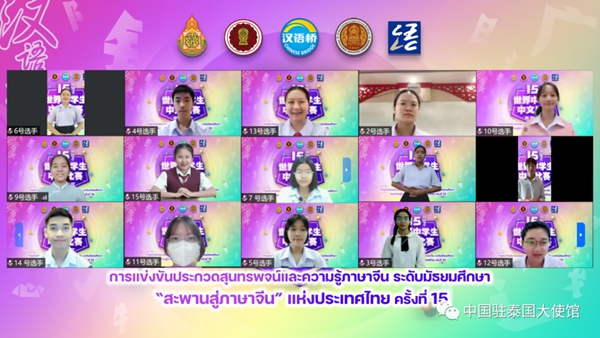 第15屆“漢語橋”世界中學生中文比賽泰國賽區活動于7月17日以線上方式成功舉辦。中國駐泰國大使韓志強、泰國教育部基礎教育委員會秘書長安鵬·披納薩、職業教育委員會副秘書長蒙通?帕素萬和民校教育委員會副秘書長巴帕·拉達納阿倫等受邀出席并致辭。