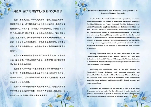 柬埔寨婦女事務代理大臣肯桑瓦達,老撾人民革命黨中央委員、老撾婦聯主席因拉萬·喬本潘,緬甸婦女事務聯合會主席德德辛、泰華婦女聯合會主席陳秀珍、越南婦聯第一副主席杜氏秋草、中國駐緬甸大使陳海、緬甸駐華大使苗丹佩以及中國和湄公河國家女性科技創新杰出代表線上參會發言。各方深情回顧瀾湄國家婦女源遠流長的深厚友誼,就瀾湄國家婦女推動創新發展交流了經驗。瀾湄國家代表高度贊揚中國經濟社會發展和婦女事業進步取得的巨大成就,高度評價瀾湄國家婦女參與科技創新和促進區域發展的積極成果,感謝全國婦聯為會議成功所作的積極努力,認為對話會凝聚了共識,豐富了瀾湄合作內涵,為深化瀾湄國家婦女友誼注入了新動力。與會代表一致表示,將進一步加強各國婦女之間的交流合作,推動婦女參與科技創新、共享創新成果,為區域繁榮發展貢獻力量。會議通過了《瀾滄江—湄公河國家婦女創新與發展倡議》。