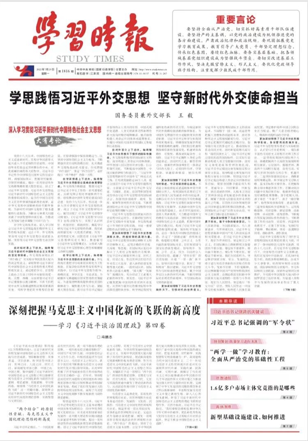 旗幟引領方向,奮斗開創未來。新的歷史征程上,我們要更加緊密團結在以習近平同志為核心的黨中央周圍,以習近平新時代中國特色社會主義思想和習近平外交思想為指引,秉持天下胸懷,踐行為國為民,奮力開創新時代中國特色大國外交新局面,為迎接黨的二十大勝利召開營造良好環境,為全面建設社會主義現代化國家作出新的貢獻?。ū疚南底髡?022年7月24日在習近平外交思想學習座談會上的主旨講話,發表時略有刪節)
