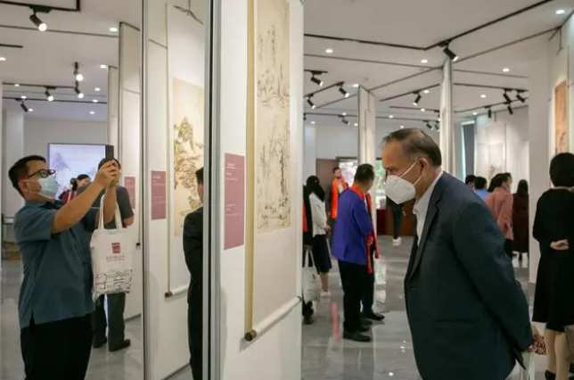 此次活動由中國文化和旅游部指導,老撾中國文化中心與遼寧省文化和旅游廳主辦、遼寧省博物館協辦。開幕式上,嘉賓們近距離觀賞40幅風格各異的明清兩代立軸山水畫(復制品)。