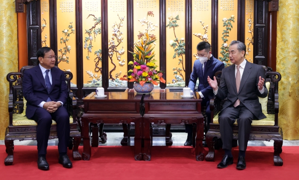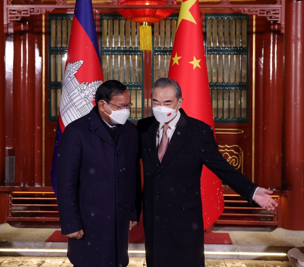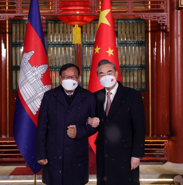 2023年2月9日,中共中央政治局委員、中央外事工作委員會辦公室主任王毅應約會見陪同柬埔寨首相洪森訪華的柬副首相兼外交大臣布拉索昆。