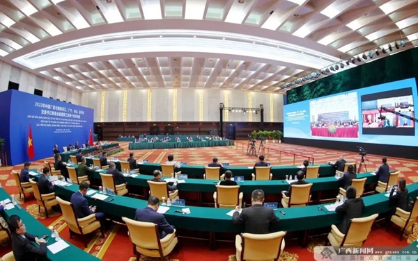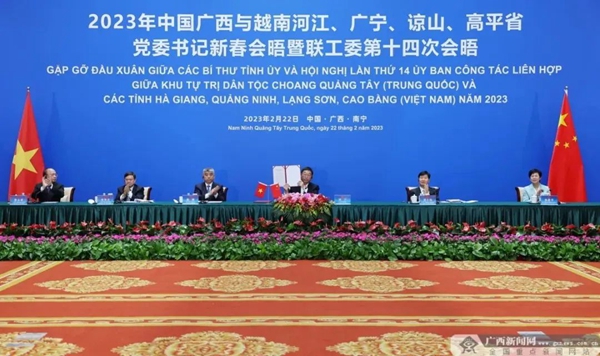 2月22日,2023年中國廣西與越南邊境四省黨委書記新春會晤活動以視頻連線方式舉行。廣西壯族自治區黨委書記、自治區人大常委會主任劉寧與越南河江省委書記鄧國慶、諒山省委書記阮國團、廣寧省委常務副書記吳皇銀、高平省委常務副書記趙庭黎進行工作會談,深入貫徹落實習近平總書記和越共中央總書記阮富仲達成的系列重要共識,共敘友好情誼,共謀合作發展。自治區黨委副書記劉小明出席活動。中共中央對外聯絡部副部長陳洲在南寧會場出席會議并致辭,越共中央對外部常務副部長阮氏黃云、中國駐越南大使熊波、越南駐華大使范星梅在各自會場致辭。