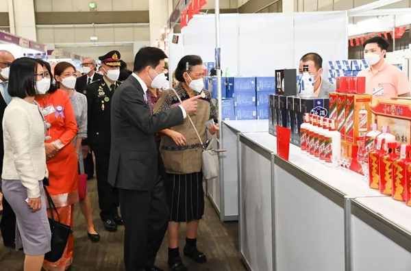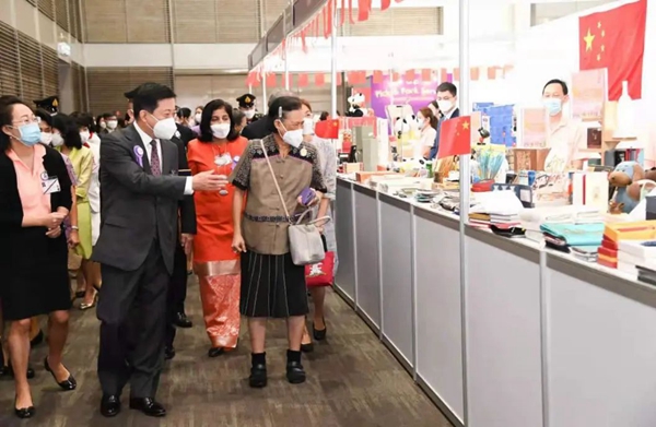 中國使館展臺洋溢著濃厚的中國風,造型精美的工藝品、雋秀典雅的文創作品、美觀實用的日用品等受到泰國當地民眾的熱烈歡迎,展臺前的來賓們絡繹不絕。
