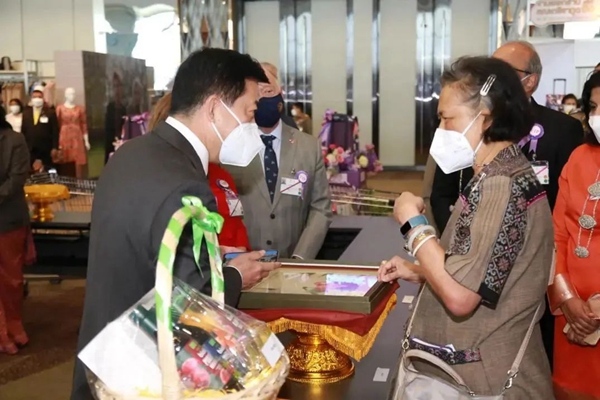 詩琳通公主在中國使館展臺前長久駐足,興致勃勃地向韓志強大使詳細了解使館展品情況,不時拿起富有中國特色的各色產品,稱贊中國使館的展品種類豐富,形式新穎。韓大使向公主介紹了中國工藝品的特色和文化寓意。