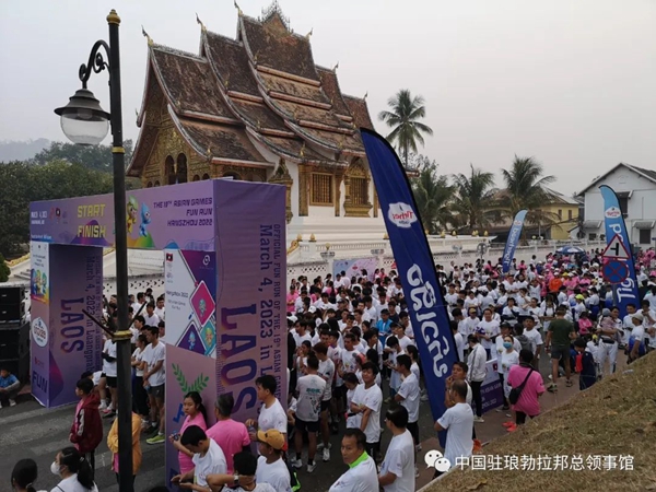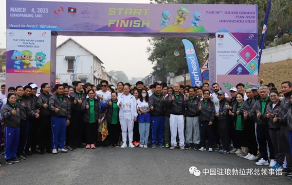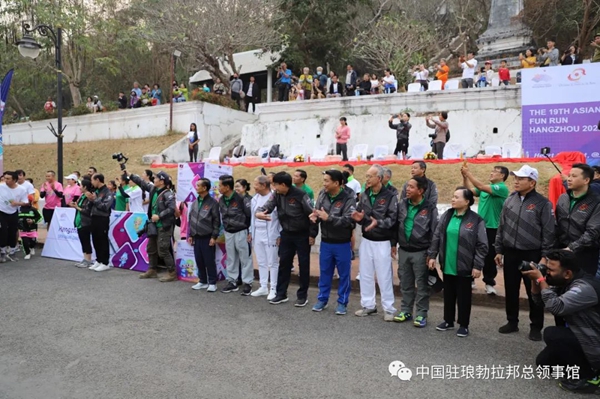 3月4日,老撾奧委會主辦的“迎杭州亞運會趣味跑”活動在老撾瑯勃拉邦王宮前舉行,駐瑯勃拉邦代總領事刁明、老撾教育與體育部部長兼國家奧委會主席普·西瑪拉馮、瑯勃拉邦省副省長本倰·瑪尼馮、杭州亞組委杭外工作部副部長杜作鋒、亞奧理事會代表等出席,老撾各界人士代表約2800人參加。