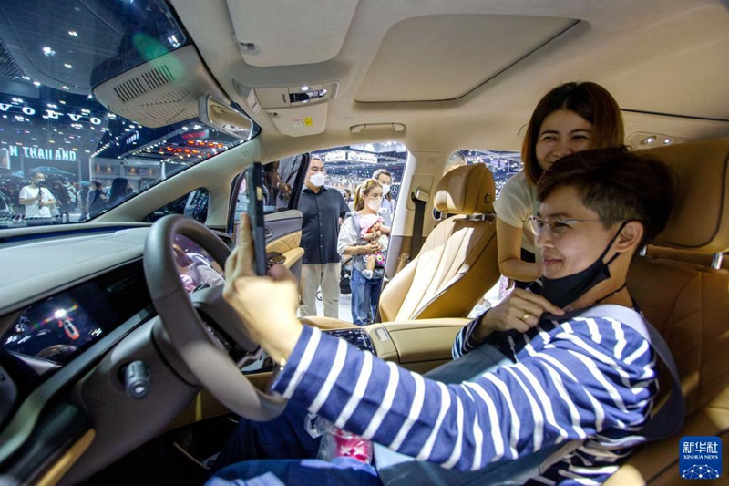 3月22日,觀眾在泰國曼谷國際車展上參觀哪吒V汽車。[新華社記者 王騰 攝]