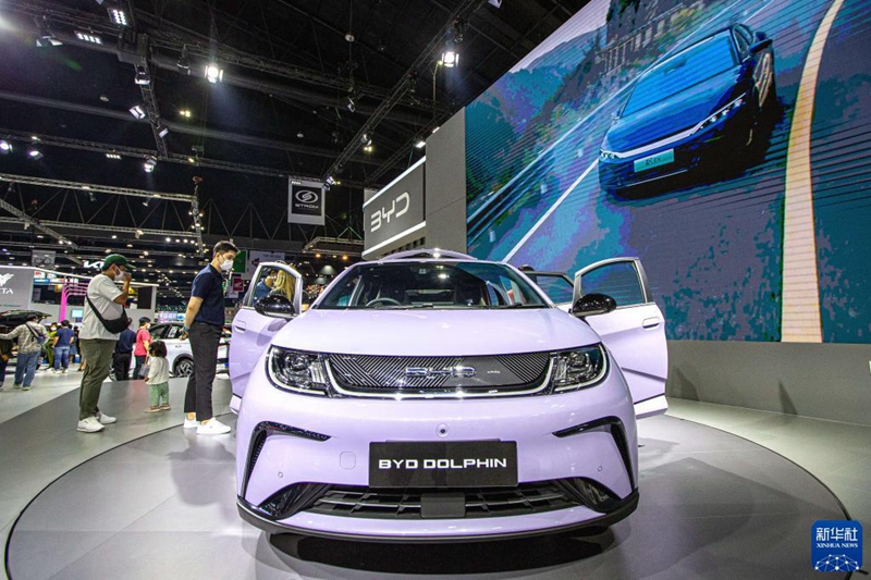 3月22日,觀眾在泰國曼谷國際車展上參觀比亞迪海豚汽車。[新華社記者 王騰 攝]