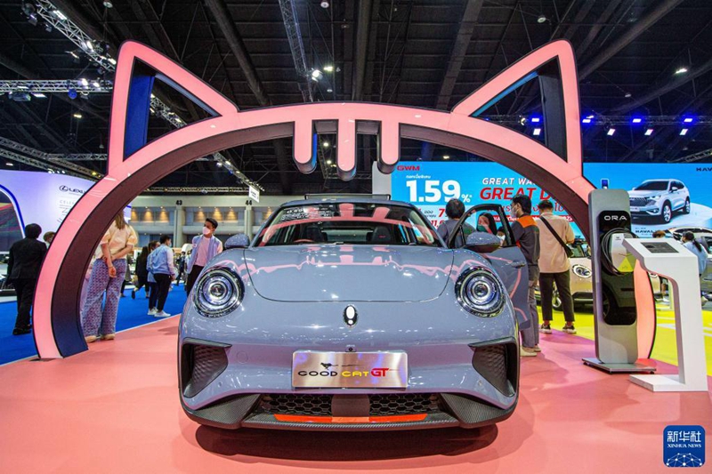 3月22日,觀眾在泰國曼谷國際車展上參觀歐拉好貓GT汽車。[新華社記者 王騰 攝]