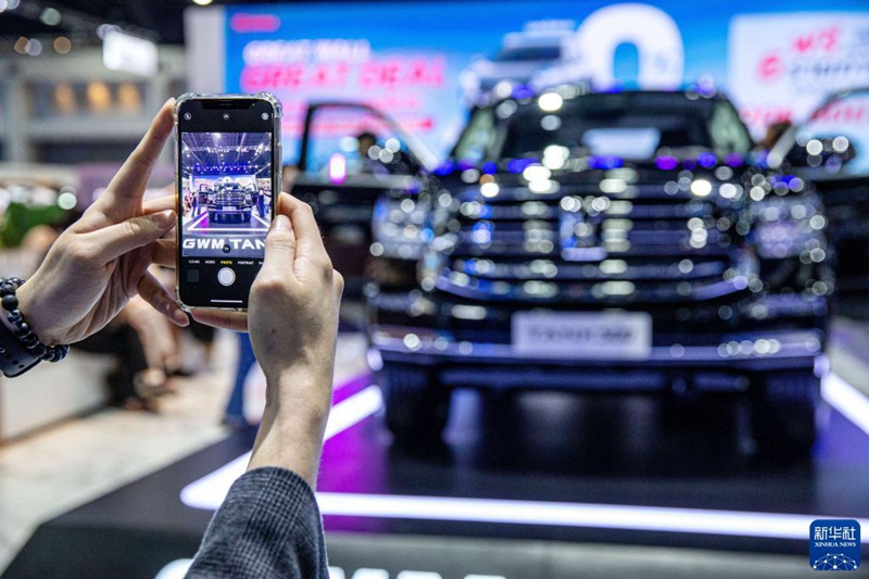 3月22日,一名觀眾在泰國曼谷國際車展上拍攝坦克500汽車。[新華社記者 王騰 攝]