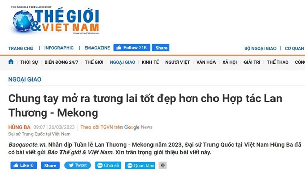在第六個“瀾湄周”之際,中國駐越南大使熊波在越南《世界與越南報》發表署名文章《攜手開創瀾湄合作更加美好的未來》。全文如下: