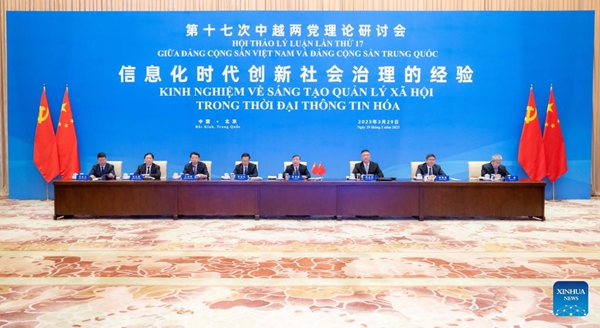 3月29日上午,以“信息化時代創新社會治理的經驗”為主題的第十七次中越兩黨理論研討會通過視頻方式舉行。中共中央政治局委員、中宣部部長李書磊和越共中央政治局委員、中央理論委員會主席、胡志明國家政治學院院長阮春勝出席并作主旨報告。