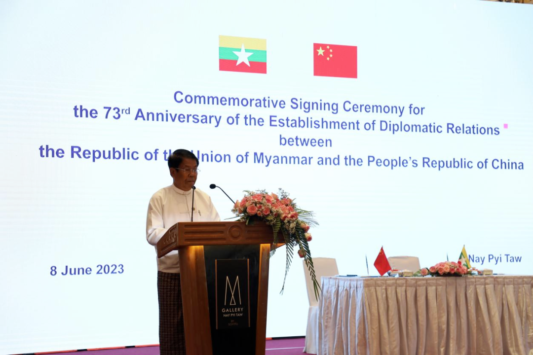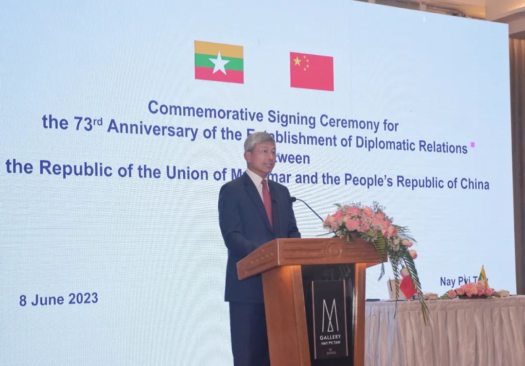 6月8日中緬建交73周年之際,中國駐緬甸大使陳海在內比都出席瀾湄合作專項基金2023年緬方項目、中國援緬新一批300萬劑新冠疫苗、援緬現代化培訓實驗室物資項目、援緬昂山體育場重建項目可行性研究等中緬合作文件簽署和交換儀式。緬甸外交部、衛生部、科技部、體育與青年事務部等10個聯邦部委部長或高級代表出席。