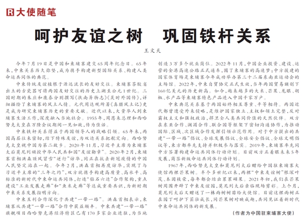 7月19日,為紀念中柬建交65周年,中國駐柬埔寨大使王文天在《人民日報》“大使隨筆”欄目發表署名文章《呵護友誼之樹鞏固鐵桿關系》。全文如下: