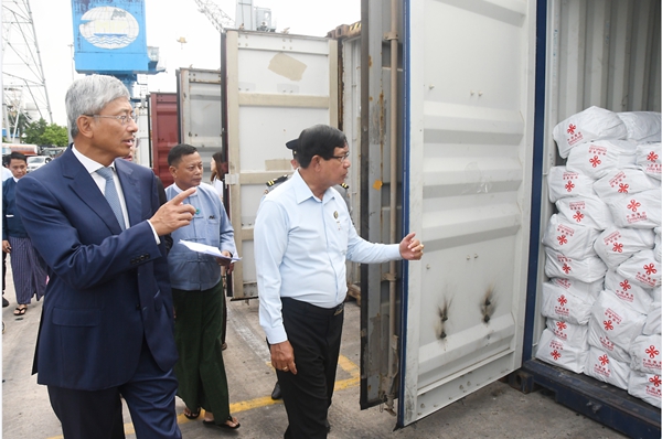 7月21日,中國政府援緬甸應對風災人道主義物資交接儀式在仰光港舉行。仰光省首席部長梭登、中國駐緬甸大使陳海、參贊歐陽道冰等出席。