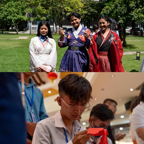 在隨后的文化體驗環節,同學們身著漢服在使館院內的“中柬友誼園”拍照留念并認真體驗毛筆書法和傳統剪紙。同學們紛紛表示,感謝使館在中柬建交65周年的特殊日子舉辦開放日活動,讓他們有機會近距離了解中柬鐵桿友誼的過去、現在與未來,愿為中柬命運共同體建設做出貢獻。