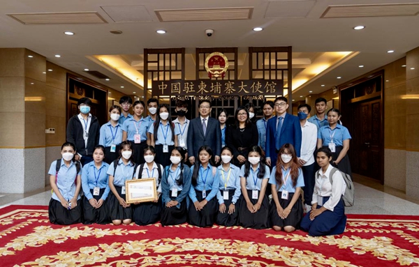 7月19日,駐柬埔寨使館舉辦“慶祝中柬建交65周年”開放日活動,柬埔寨亞歐大學國際關系專業師生代表30人來館參觀交流。
