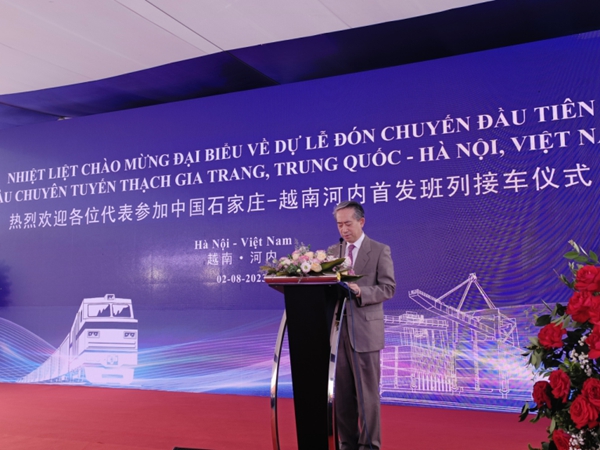 8月2日,中國駐越南大使熊波在越南河內安員車站出席中國石家莊—越南河內首發國際班列接車儀式。河北省委常委、石家莊市委書記張超超、越南國資委副主任阮玉景、交通運輸部副部長阮名輝等出席。