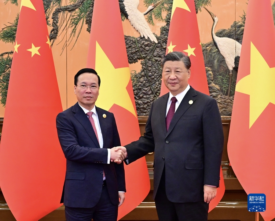 2023年10月20日上午,國家主席習近平在人民大會堂會見來華出席第三屆“一帶一路”國際合作高峰論壇的越南國家主席武文賞。