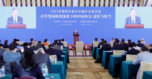 2024年1月9日,中共中央政治局委員、外交部長王毅在北京出席2023年國際形勢與中國外交研討會開幕式并發表演講。