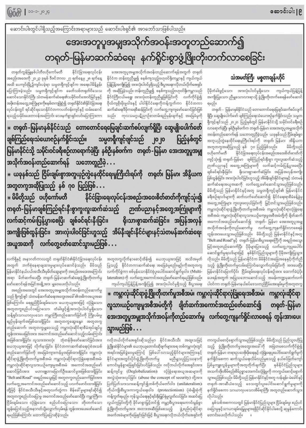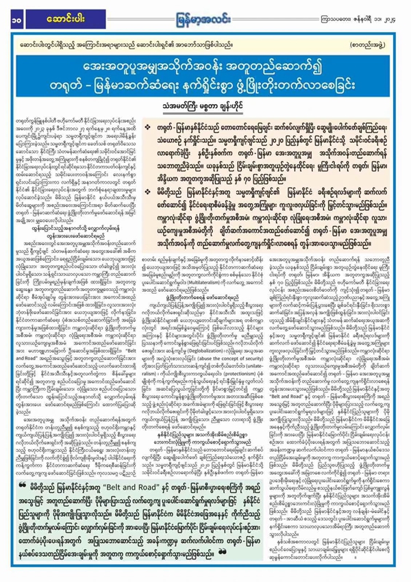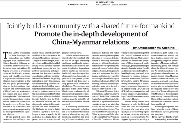 2024年1月11日,駐緬甸大使陳海在緬甸官方媒體《環球新光報》(英文)、《緬甸之光報》(緬文)、《妙瓦底》(緬文)發表題為《共建人類命運共同體推動中緬關系深入發展》的署名文章,宣介中央外事工作會議精神,展望中緬關系與合作。全文如下: