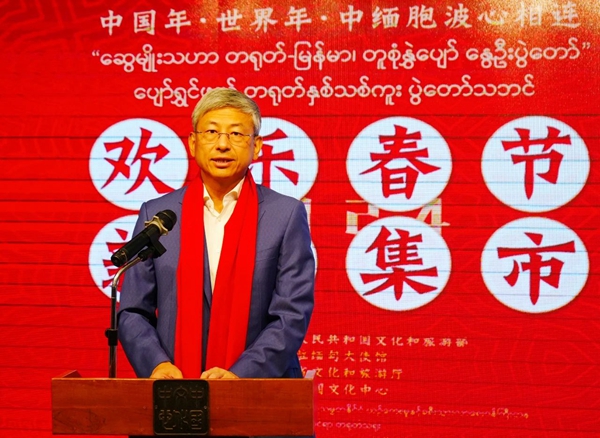 在龍年春節來臨之際,由中國文化和旅游部、中國駐緬甸大使館主辦,云南省文化和旅游廳、仰光中國文化中心承辦的2024“歡樂春節·新春集市”活動2月4日在仰光開幕。中國駐緬甸大使陳海、仰光省首席部長梭登、仰光市市長博泰、朝鮮、新加坡、老撾、越南、泰國等多國駐緬使節、中國駐緬甸使館潘峰參贊、虞晉峰參贊、仰光中國文化中心向劍波主任以及緬甸文化、教育等各界人士、在緬中資企業與華人華僑代表出席。