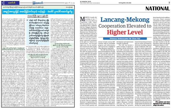 在第七個“瀾湄周”之際,中國駐緬甸大使陳海于3月20日在緬甸官媒《緬甸環球新光報》和《緬甸之光》發表題為《瀾湄合作提質升級》的署名文章。文章表示,瀾湄合作從無到有、提質升級,瀾湄國家命運共同體建設不斷走深走實。中緬瀾湄合作取得豐碩成果,為緬甸經濟社會可持續發展和民生改善做出了重要貢獻。中國式現代化將為緬甸等湄公河國家發展帶來新的利好,為瀾湄合作增添更大動能。中國愿在推動自身高質量發展的過程中助力中緬瀾湄合作提質升級,讓胞波情誼在新時代煥發新光彩。文章全文如下: