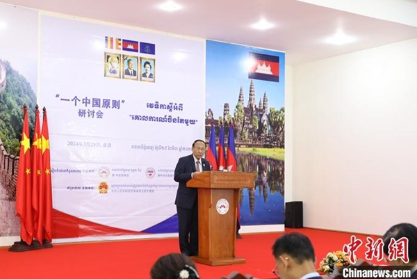 當地時間3月29日,柬埔寨中國友好協會和柬中關系發展學會聯合舉辦一個中國原則研討會。中國駐柬埔寨使館公使銜參贊陳聰、柬中友好協會主席艾森沃出席開幕式并致辭,柬中關系發展學會會長謝莫尼勒主持。柬政府有關部門、政黨、民間組織、智庫、高校近200名代表參加。