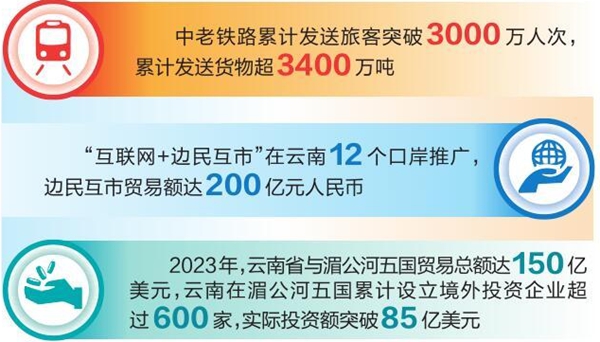 加強互聯,與各國共建綜合立體交通網。中老鐵路累計發送旅客突破3000萬人次,累計發送貨物超3400萬噸。創新開行“滬滇·瀾湄線”“云貴·瀾湄線”“瀾湄蓉渝歐快線”“中歐+瀾湄線”國際貨運班列,國際大通道效應日益顯現。云南企業投資、建設、運營的柬埔寨暹粒吳哥國際機場于2023年10月通航運營。中越跨境標準軌鐵路聯通、中緬鐵路通道、中老高速等區域互聯互通項目穩步推進。